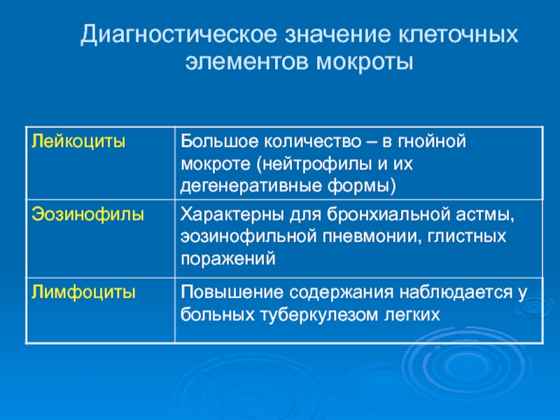 Слайд 15Диагностическое значение клеточных элементов мокроты