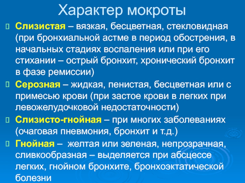 Слизисто-гнойная – при многих заболеваниях (очаговая пневмония, бронхит и т.д.)