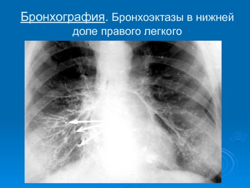 Слайд 47Бронхография. Бронхоэктазы в нижней доле правого легкого