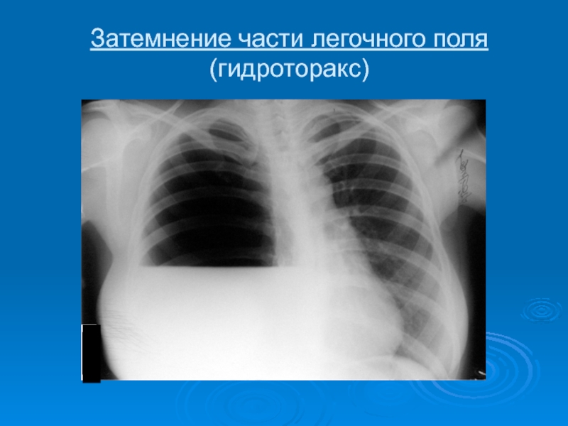 Слайд 39Затемнение части легочного поля (гидроторакс)