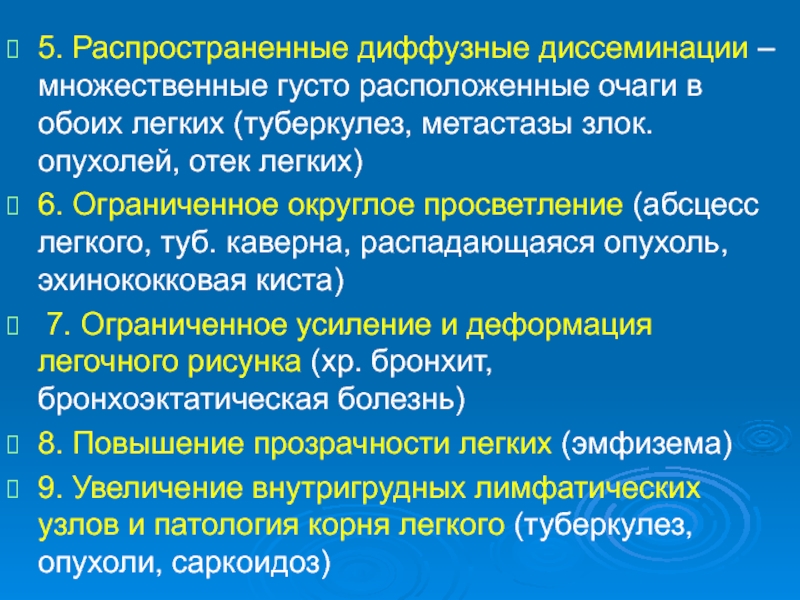 4. Отдельные очаги в лег. поле (туберкулез, очаговые пневмонии, рак бронха, метастазы опухоли)