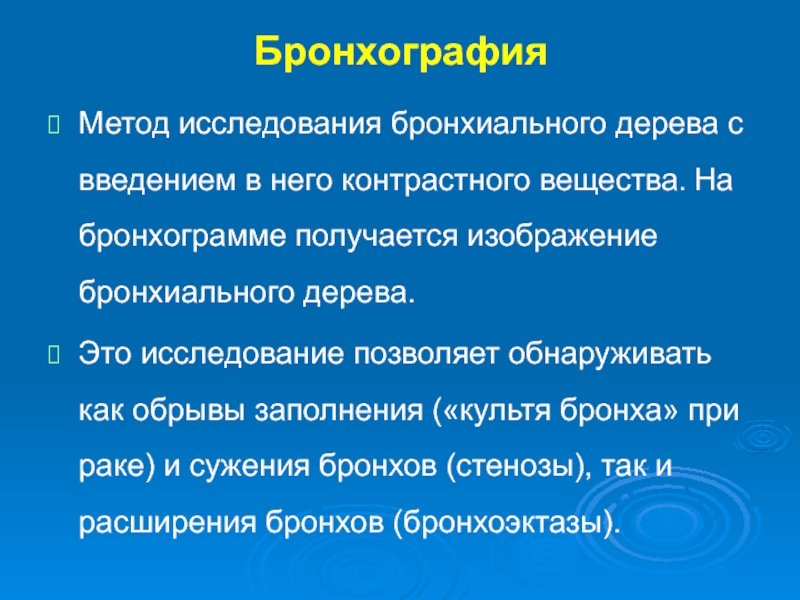 обнаруживать как обрывы заполнения («культя бронха» при раке) и сужения бронхов (стенозы), так и расширения бронхов (бронхоэктазы).