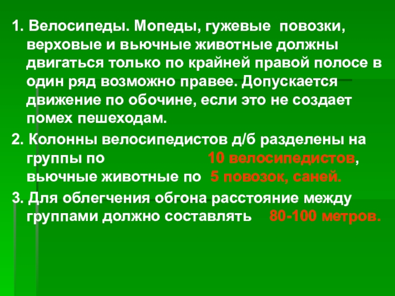 Слайд 41. Велосипеды. Мопеды, гужевые повозки, верховые и вьючные животные должны