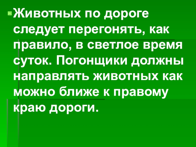 Слайд 12Животных по дороге следует перегонять, как правило, в светлое время