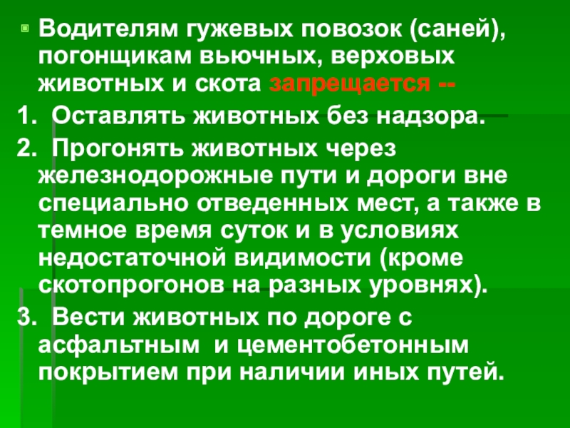 Слайд 14Водителям гужевых повозок (саней), погонщикам вьючных, верховых животных и скота