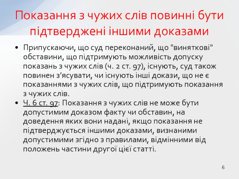 Ч. 6 ст. 97: Показання з чужих слів не може бути допустимим доказом факту чи обставин, на доведення яких вони надані, якщо показання не підтверджується іншими доказами, визнаними допустимими згідно з правилами, відмінними від положень частини другої цієї статті.