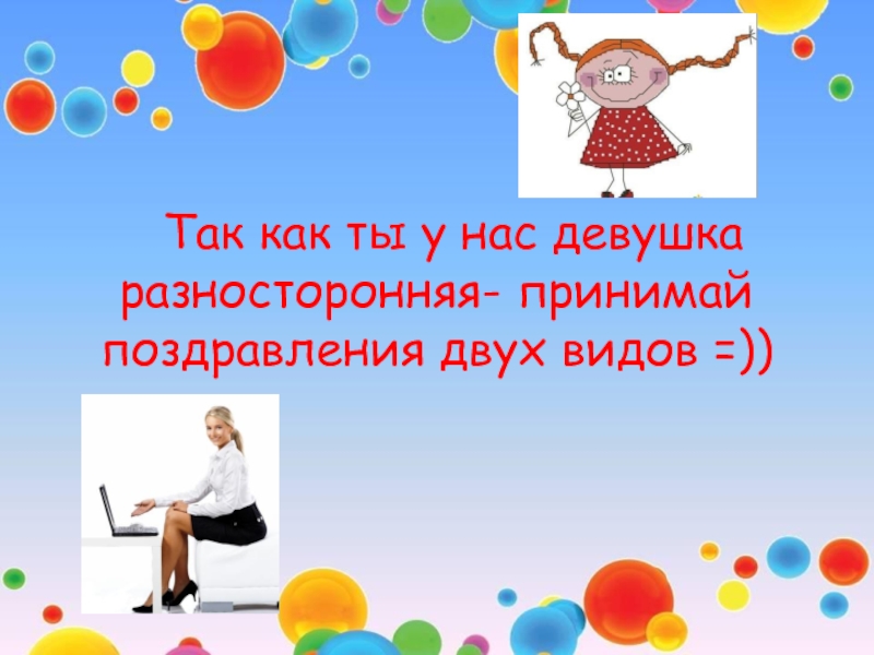 Слайд 3Так как ты у нас девушка разносторонняя- принимай поздравления двух