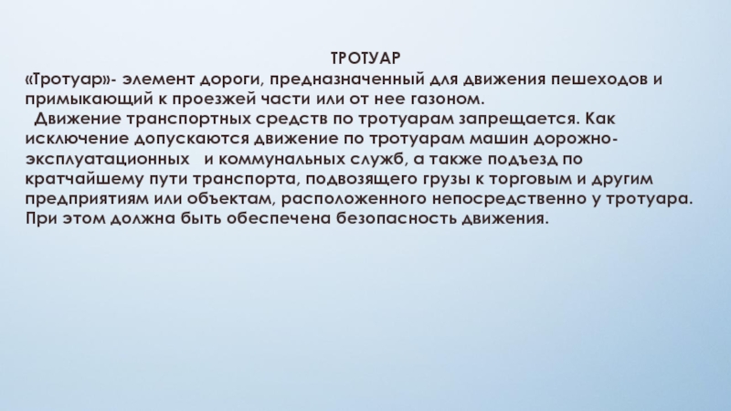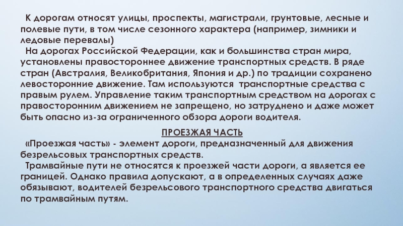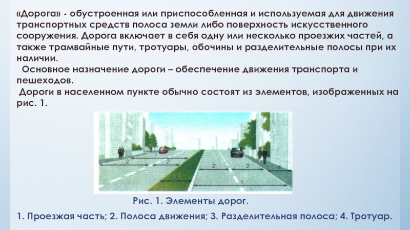 себя одну или несколько проезжих частей, а также трамвайные пути, тротуары, обочины и разделительные полосы при их наличии.Основное назначение дороги – обеспечение движения транспорта и пешеходов.