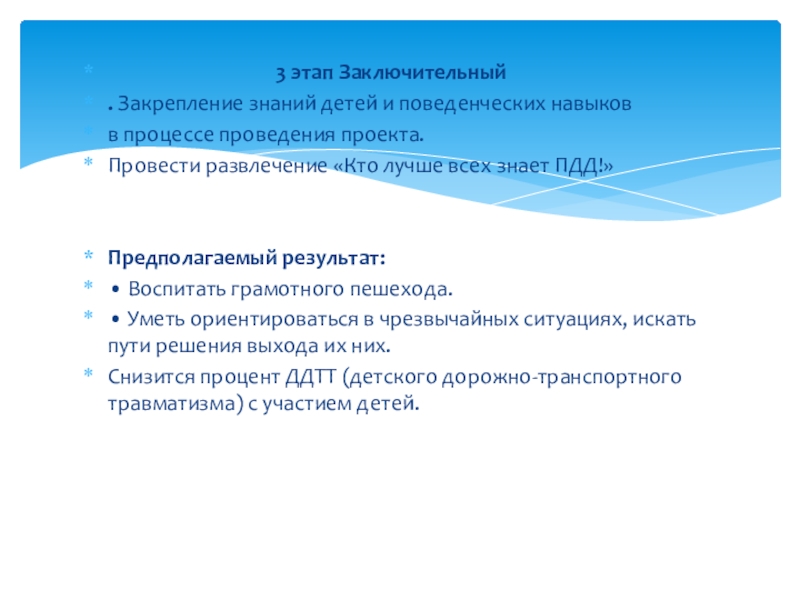 Снизится процент ДДТТ (детского дорожно-транспортного травматизма) с участием детей.