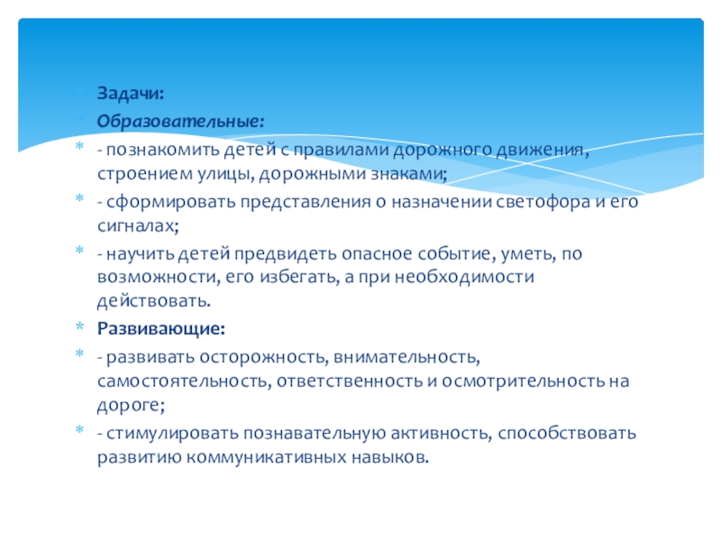 - познакомить детей с правилами дорожного движения, строением улицы, дорожными