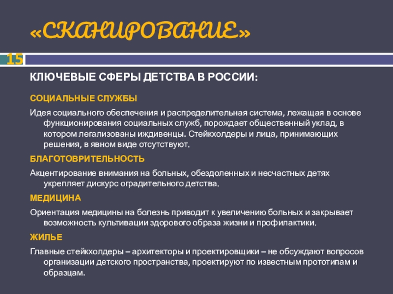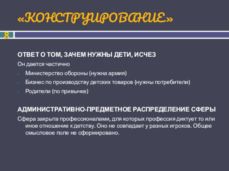 Сфера закрыта профессионалами, для которых профессия диктует то или иное отношение к детству. Оно не совпадает у разных игроков. Общее смысловое поле не сформировано.