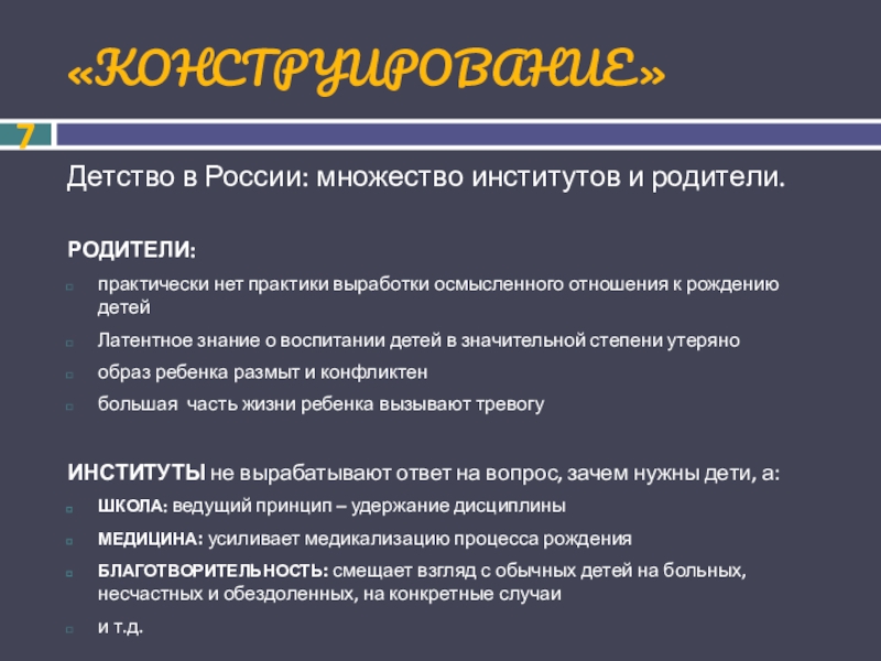 «профессионализация» родительства, развитие сервисов детства и инфраструктуры детства)