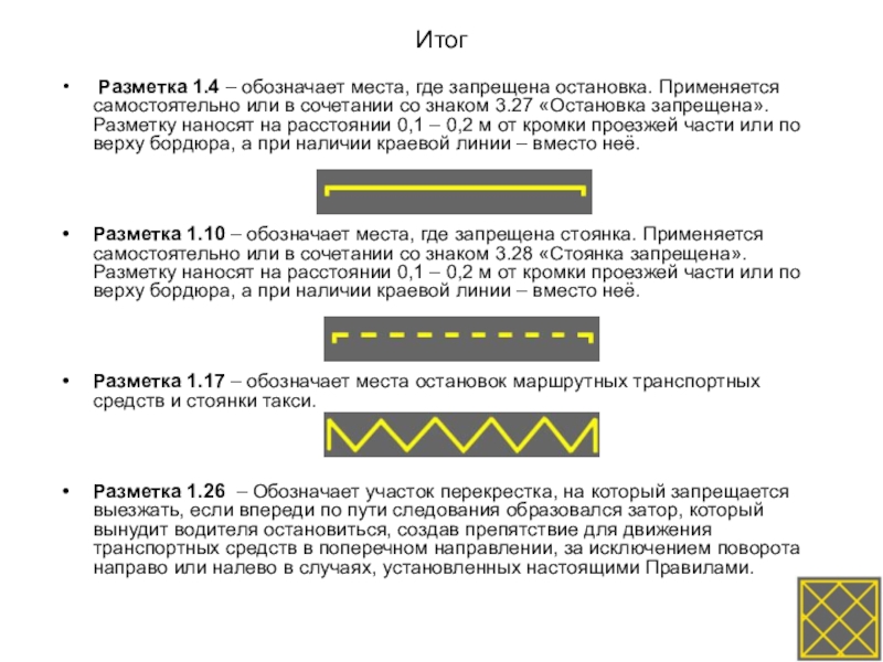самостоятельно или в сочетании со знаком 3.27 «Остановка запрещена». Разметку
