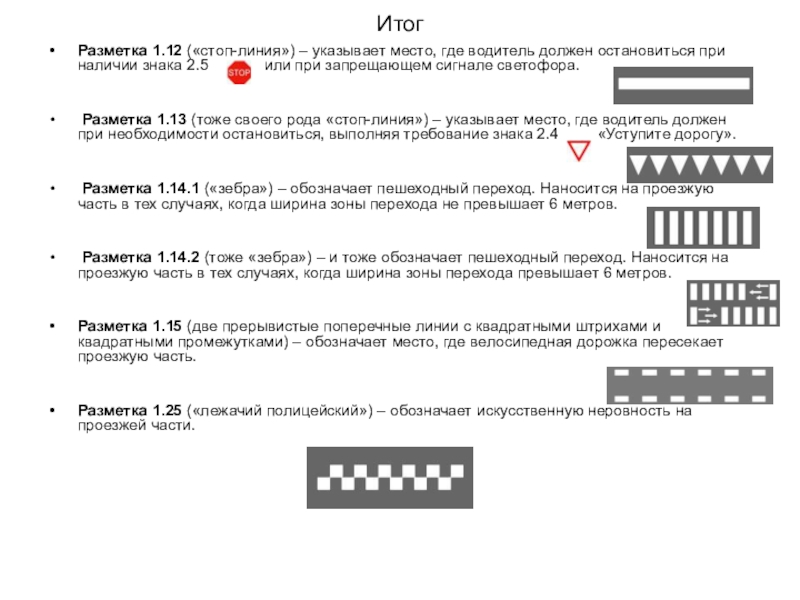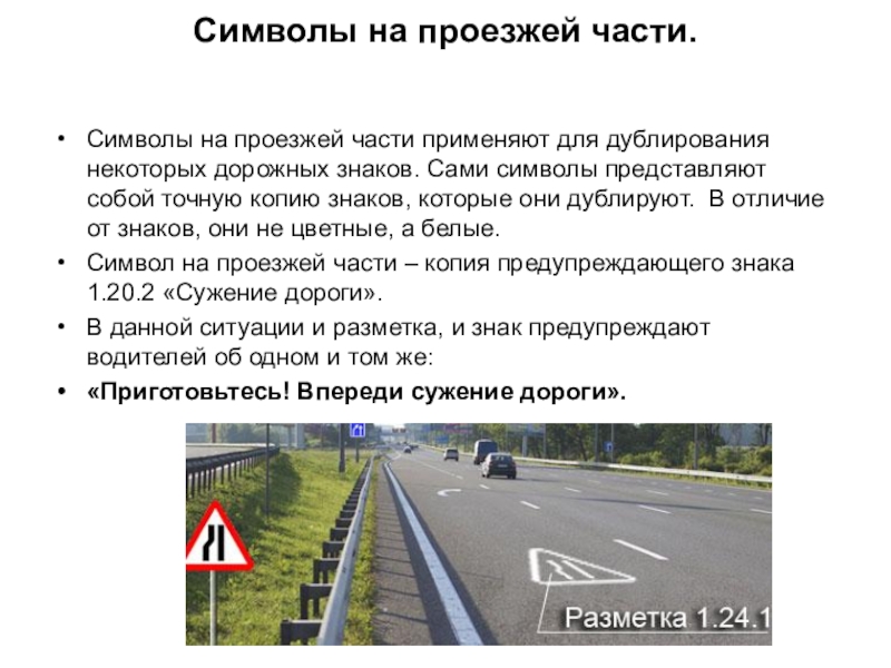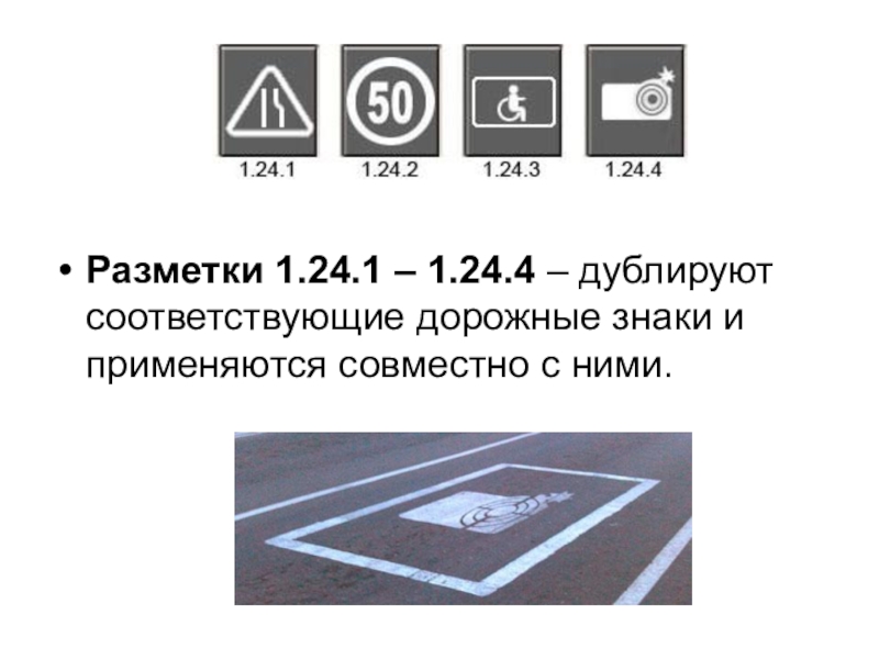 Слайд 14Разметки 1.24.1 – 1.24.4 – дублируют соответствующие дорожные знаки и