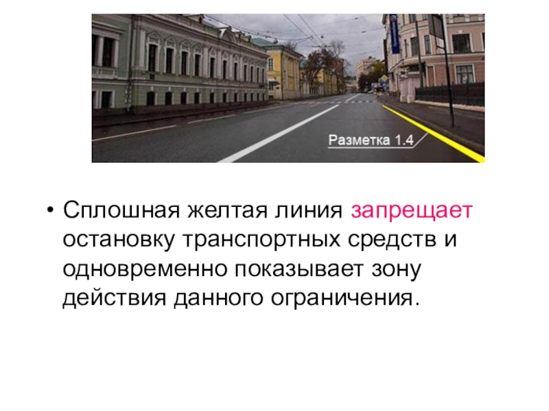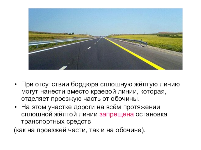 Слайд 16Сплошная желтая линия запрещает остановку транспортных средств и одновременно показывает