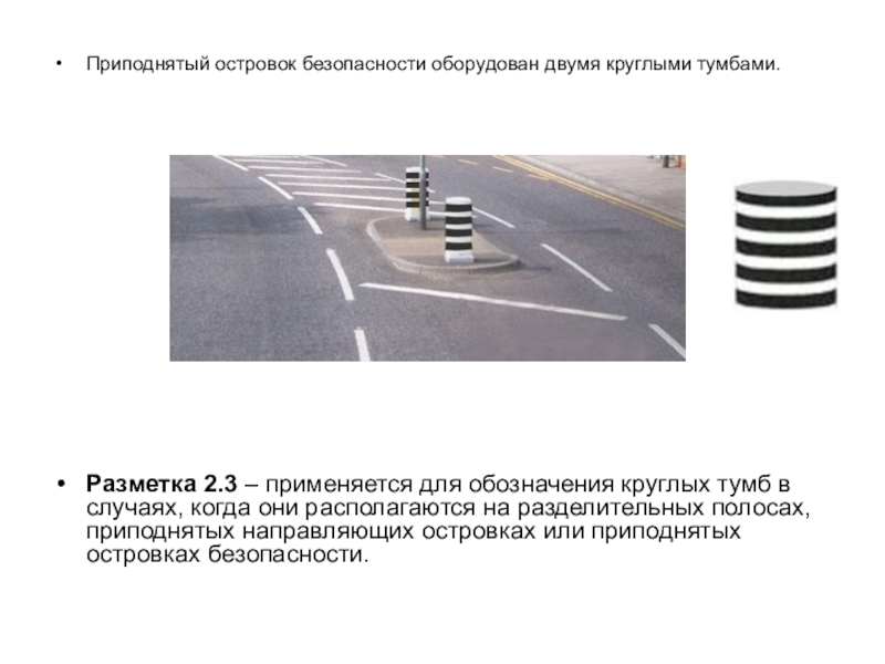 Слайд 25Приподнятый островок безопасности оборудован двумя круглыми тумбами.