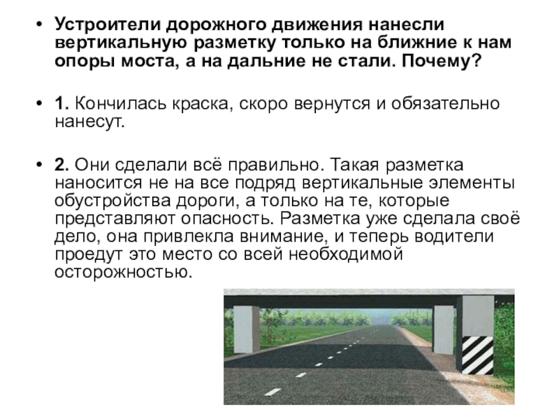 Слайд 31Устроители дорожного движения нанесли вертикальную разметку только на ближние к