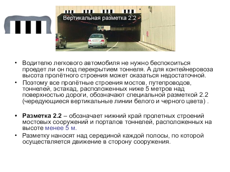 Поэтому все пролётные строения мостов, путепроводов, тоннелей, эстакад, расположенных ниже 5 метров над поверхностью дороги, обозначают специальной разметкой 2.2 (чередующиеся вертикальные линии белого и черного цвета) .