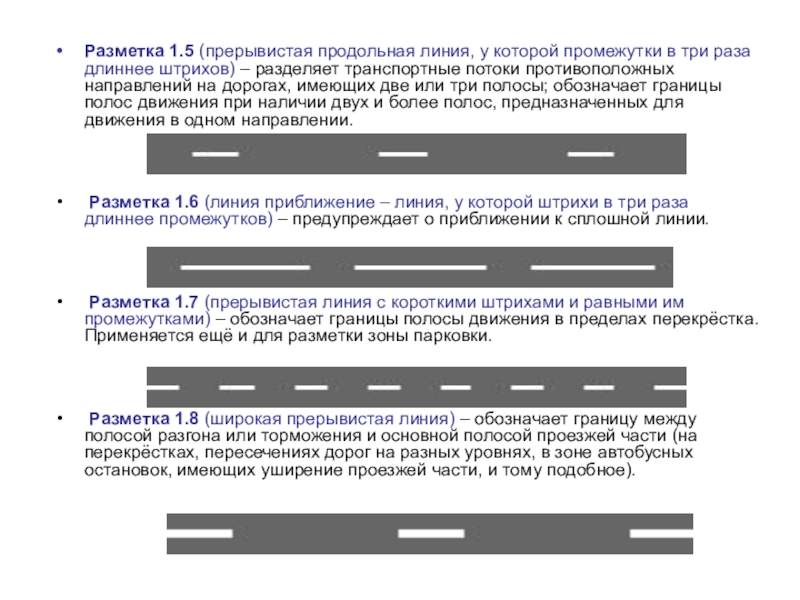 Разметка 1.8 (широкая прерывистая линия) – обозначает границу между полосой разгона или торможения и основной полосой проезжей части (на перекрёстках, пересечениях дорог на разных уровнях, в зоне автобусных остановок, имеющих уширение проезжей части, и тому подобное).