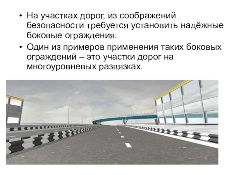 Слайд 27На участках дорог, из соображений безопасности требуется установить надёжные боковые