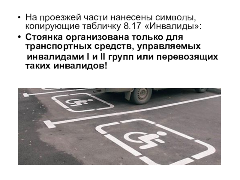 Слайд 13На проезжей части нанесены символы, копирующие табличку 8.17 «Инвалиды»: