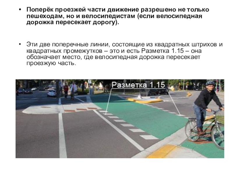 Разметка 1.15 (две прерывистые поперечные линии с квадратными штрихами и квадратными промежутками) – обозначает место, где велосипедная дорожка пересекает проезжую часть.