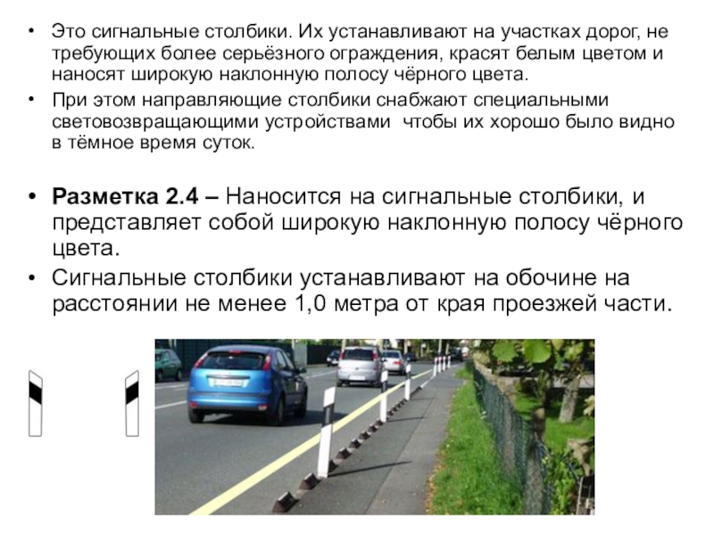 Слайд 26Это сигнальные столбики. Их устанавливают на участках дорог, не требующих
