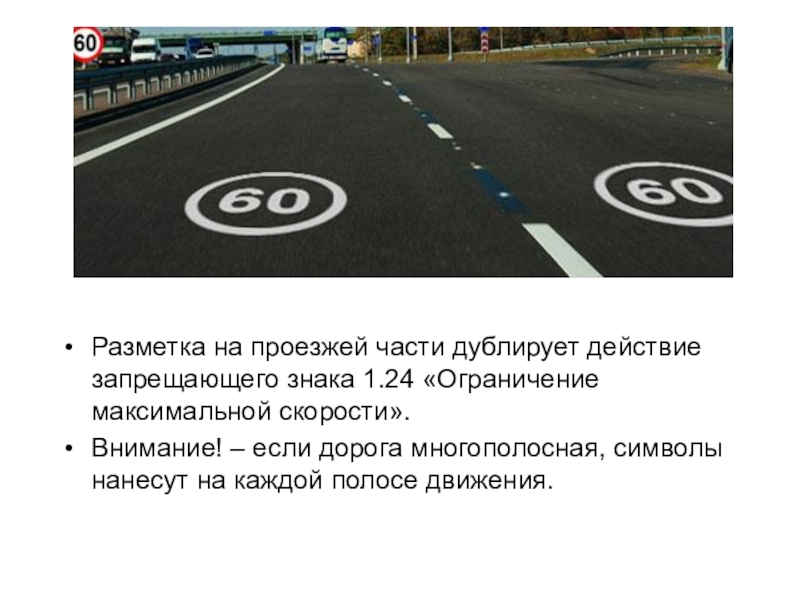 Слайд 12Разметка на проезжей части дублирует действие запрещающего знака 1.24 «Ограничение