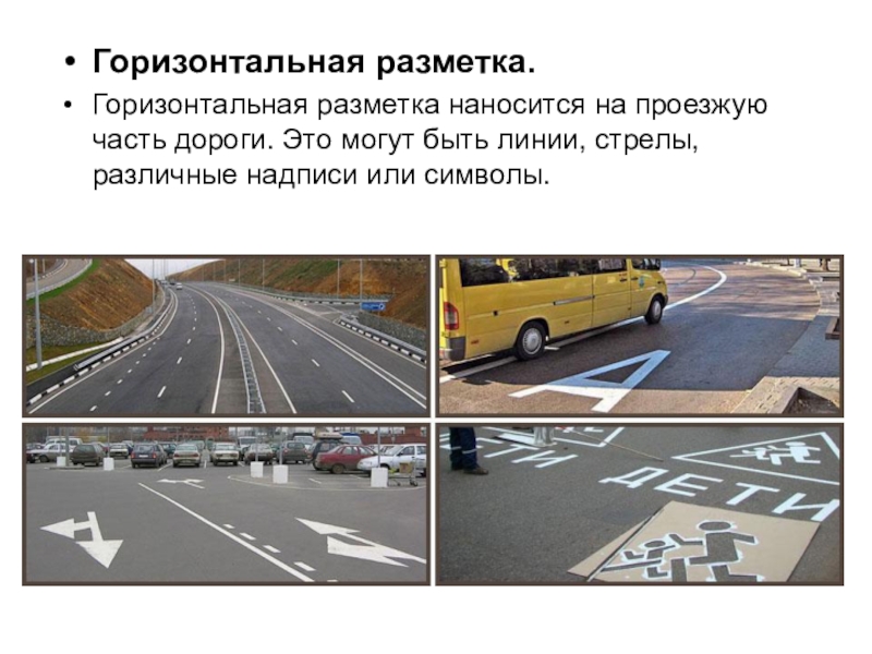 Горизонтальная разметка наносится на проезжую часть дороги. Это могут