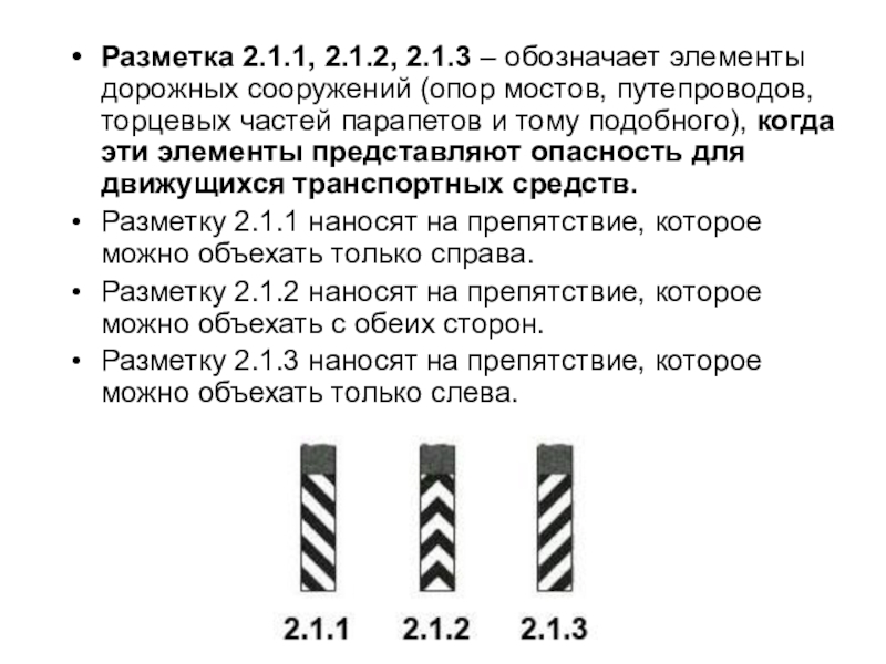 Слайд 23Разметка 2.1.1, 2.1.2, 2.1.3 – обозначает элементы дорожных сооружений (опор