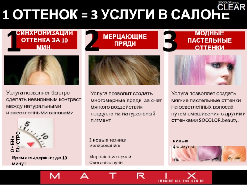 Услуга позволяет создать мягкие пастельные оттенки на осветленных волосах путем смешивания с другими оттенками SOCOLOR.beauty.