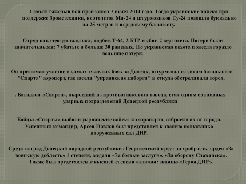 Он принимал участие в самых тяжелых боях за Донецк, штурмовал со своим батальоном "Спарта" аэропорт, где засели "украинские киборги" и откуда обстреливали город.