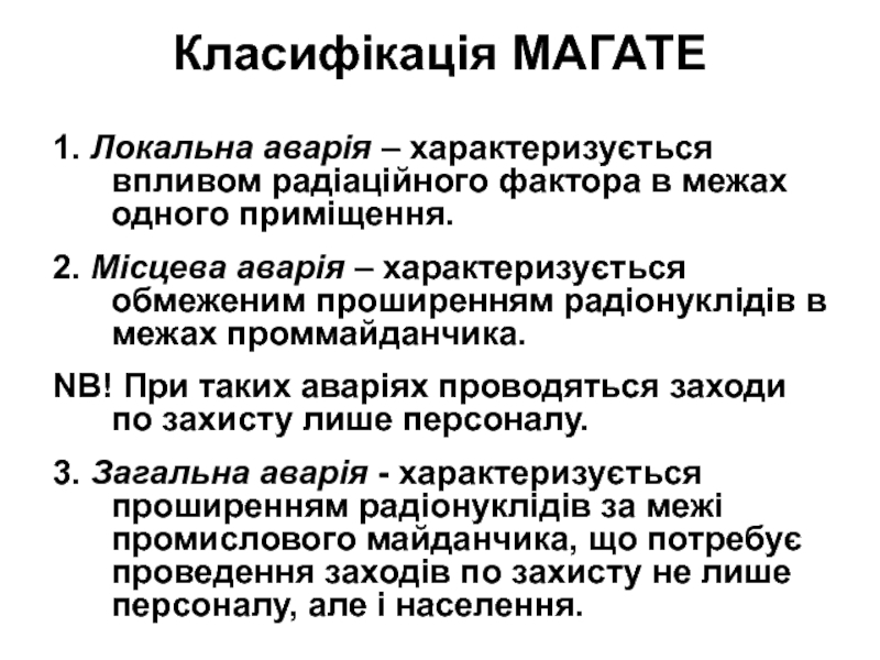 3. Загальна аварія - характеризується проширенням радіонуклідів за межі промислового майданчика, що потребує проведення заходів по захисту не лише персоналу, але і населення.