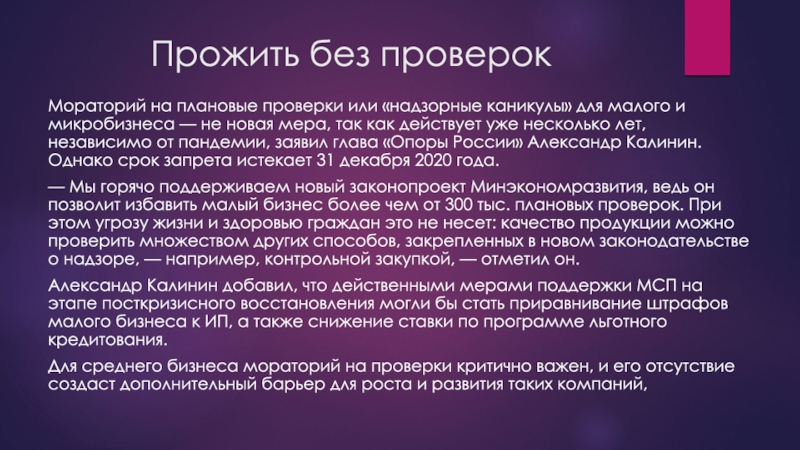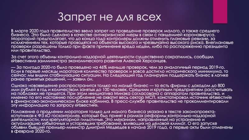 на проведение проверок малого, а также среднего бизнеса. Это было