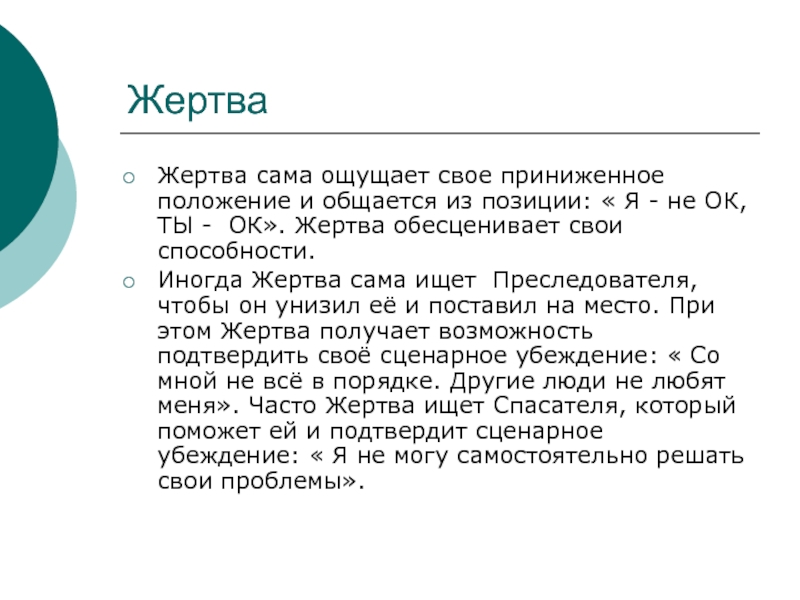 Жертва сама ощущает свое приниженное положение и общается из позиции: