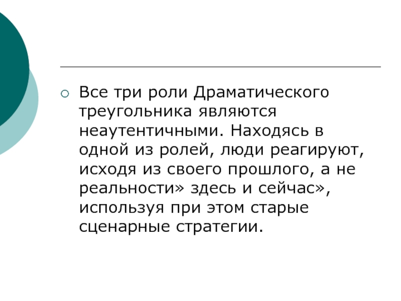 Слайд 11Все три роли Драматического треугольника являются неаутентичными. Находясь в одной