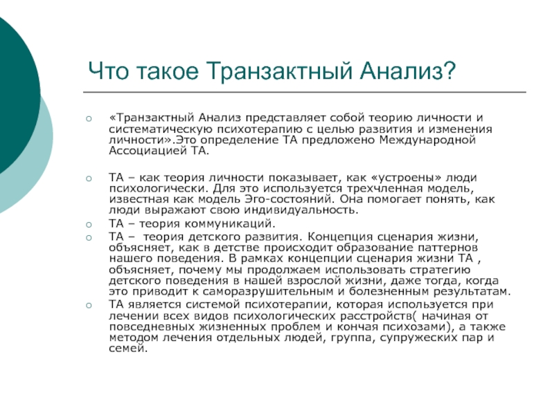 систематическую психотерапию с целью развития и изменения личности».Это определение ТА