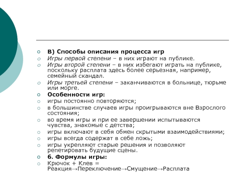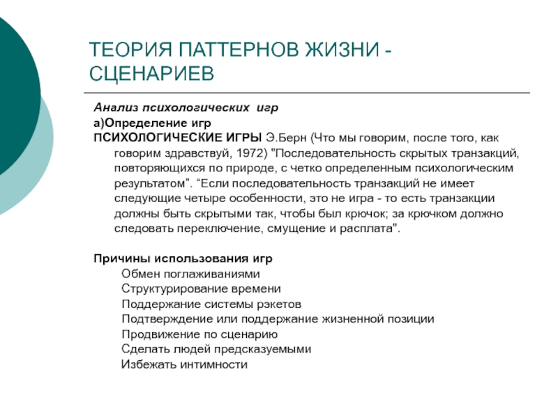 "Последовательность скрытых транзакций, повторяющихся по природе, с четко определенным психологическим результатом”. “Если последовательность транзакций не имеет следующие четыре особенности, это не игра - то есть транзакции должны быть скрытыми так, чтобы был крючок; за крючком должно следовать переключение, смущение и расплата".