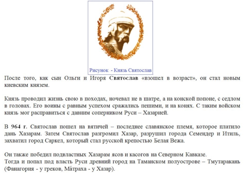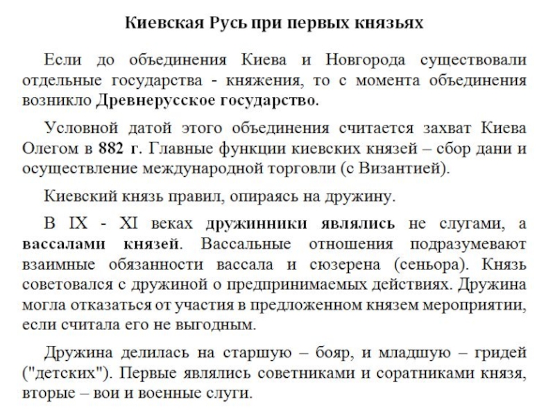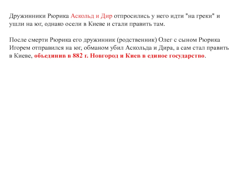 стали править там.После смерти Рюрика его дружинник (родственник) Олег с сыном Рюрика Игорем отправился на юг, обманом убил Аскольда и Дира, а сам стал править в Киеве, объединив в 882 г. Новгород и Киев в единое государство.