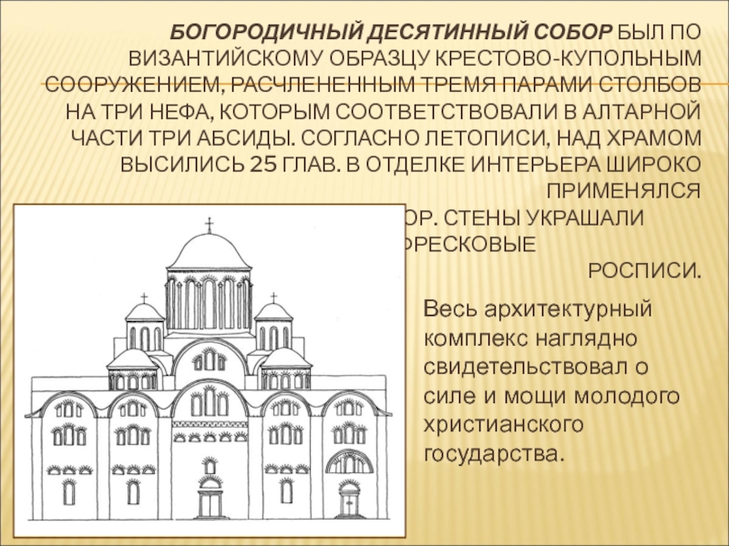 Слайд 15Богородичный Десятинный собор был по византийскому образцу крестово-купольным сооружением, расчлененным