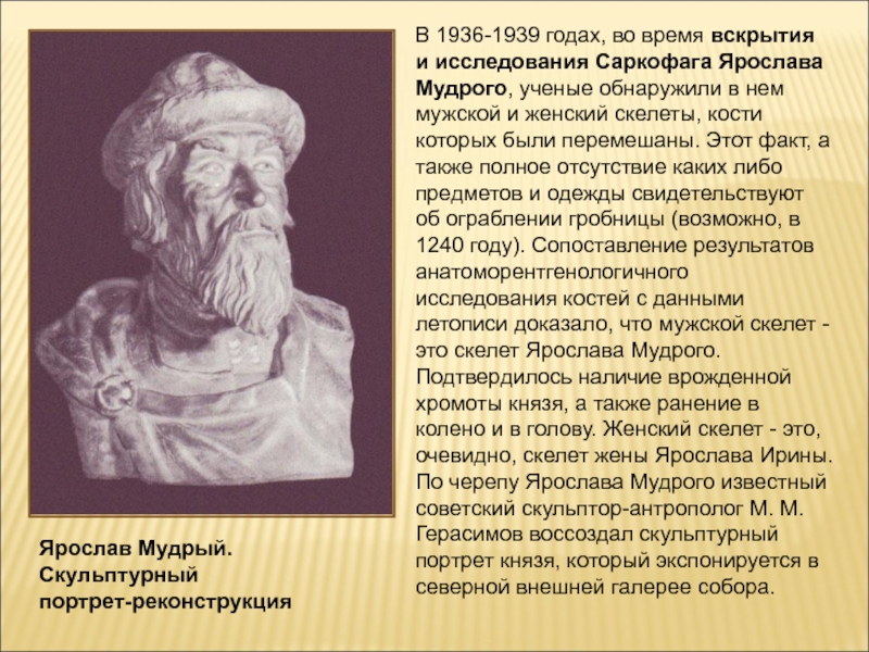которых были перемешаны. Этот факт, а также полное отсутствие каких либо предметов и одежды свидетельствуют об ограблении гробницы (возможно, в 1240 году). Сопоставление результатов анатоморентгенологичного исследования костей с данными летописи доказало, что мужской скелет - это скелет Ярослава Мудрого. Подтвердилось наличие врожденной хромоты князя, а также ранение в колено и в голову. Женский скелет - это, очевидно, скелет жены Ярослава Ирины. По черепу Ярослава Мудрого известный советский скульптор-антрополог М. М. Герасимов воссоздал скульптурный портрет князя, который экспонируется в северной внешней галерее собора.