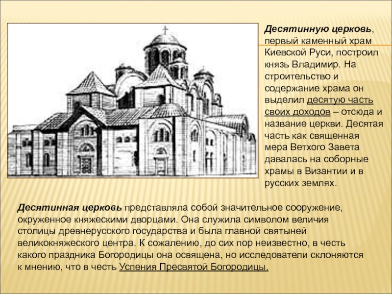 Десятинная церковь представляла собой значительное сооружение, окруженное княжескими дворцами. Она служила символом величия столицы древнерусского государства и была главной святыней великокняжеского центра. К сожалению, до сих пор неизвестно, в честь какого праздника Богородицы она освящена, но исследователи склоняются к мнению, что в честь Успения Пресвятой Богородицы.