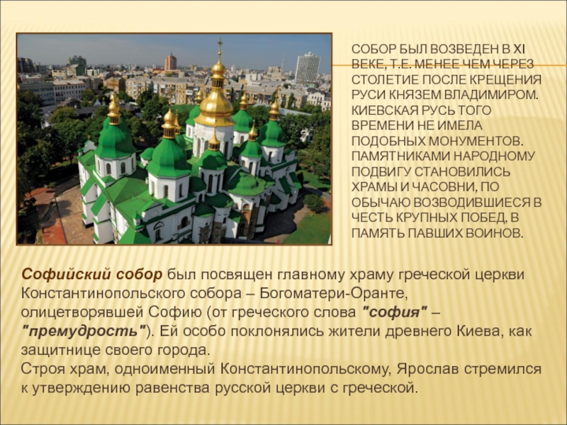 Строя храм, одноименный Константинопольскому, Ярослав стремился к утверждению равенства русской церкви с греческой.