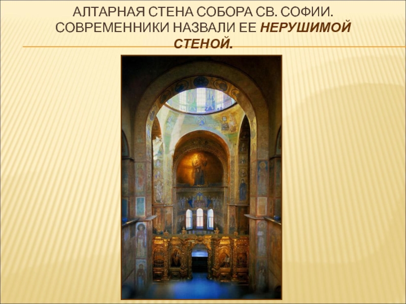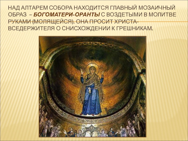 Слайд 34Над алтарем собора находится главный мозаичный образ – Богоматери-Оранты с