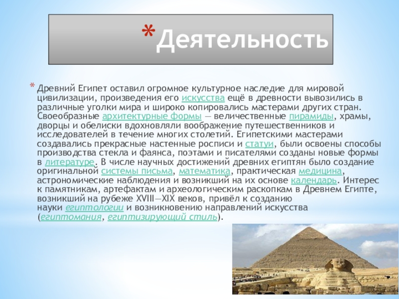 копировались мастерами других стран. Своеобразные архитектурные формы — величественные пирамиды, храмы, дворцы и обелиски вдохновляли воображение путешественников и исследователей в течение многих столетий. Египетскими мастерами создавались прекрасные настенные росписи и статуи, были освоены способы производства стекла и фаянса, поэтами и писателями созданы новые формы в литературе. В числе научных достижений древних египтян было создание оригинальной системы письма, математика, практическая медицина, астрономические наблюдения и возникший на их основе календарь. Интерес к памятникам, артефактам и археологическим раскопкам в Древнем Египте, возникший на рубеже XVIII—XIX веков, привёл к созданию науки египтологии и возникновению направлений искусства (египтомания, египтизирующий стиль).