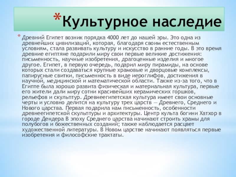 Древний Египет оставил огромное культурное наследие для мировой цивилизации, произведения
