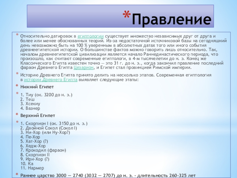 Историю Древнего Египта принято делить на несколько этапов. Современная египтология в истории Древнего Египта выявляет следующие этапы: