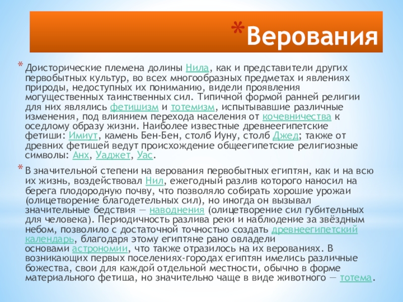 проявления могущественных таинственных сил. Типичной формой ранней религии для них являлись фетишизм и тотемизм, испытывавшие различные изменения, под влиянием перехода населения от кочевничества к оседлому образу жизни. Наиболее известные древнеегипетские фетиши: Имиут, камень Бен-Бен, столб Иуну, столб Джед; также от древних фетишей ведут происхождение общеегипетские религиозные символы: Анх, Уаджет, Уас.