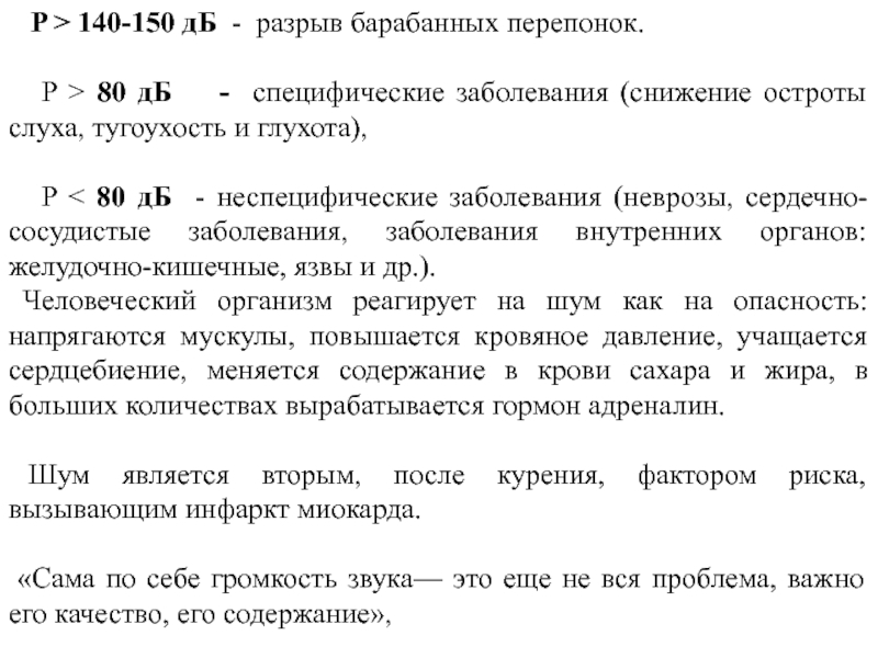 Слайд 11 P > 140-150 дБ - разрыв барабанных перепонок.