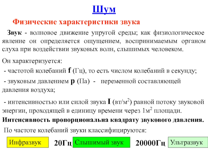 - интенсивностью или силой звука I (вт/м2) равной потоку звуковой энергии, проходящей в единицу времени через 1м2 площади.